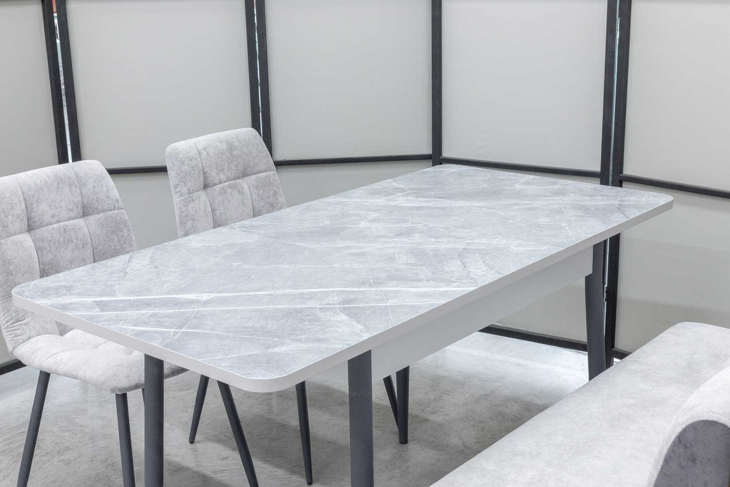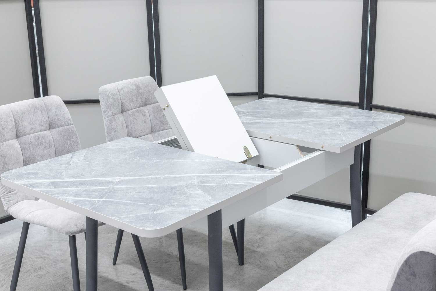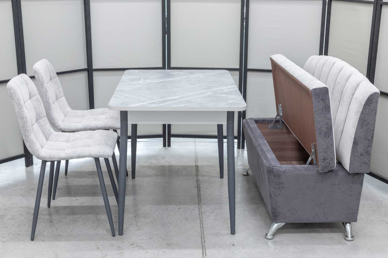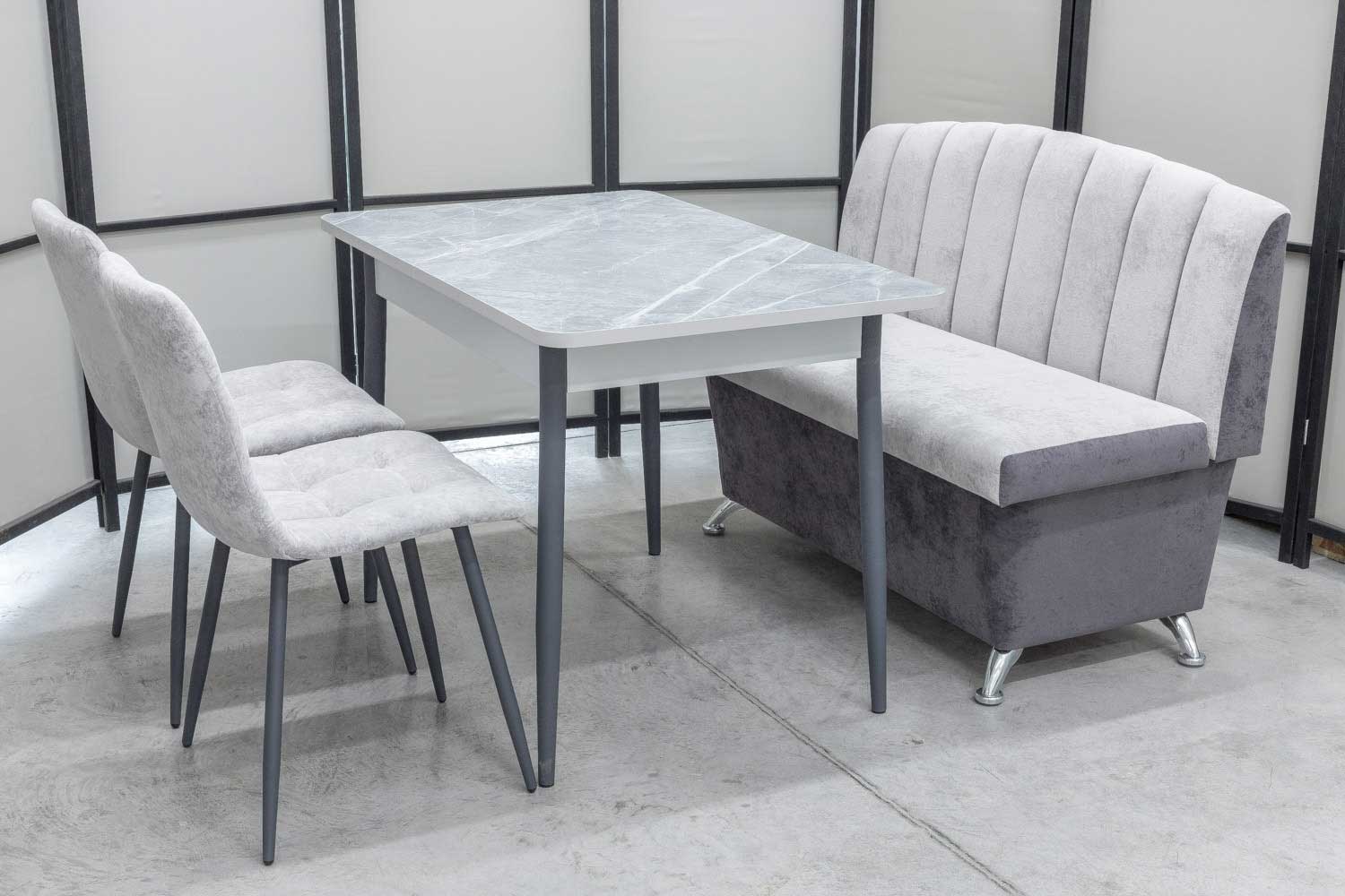 Обеденная группа состоящая из стола Ост и кухонного дивана Альт и 2-х стульев в одинаковой с диваном обивке.