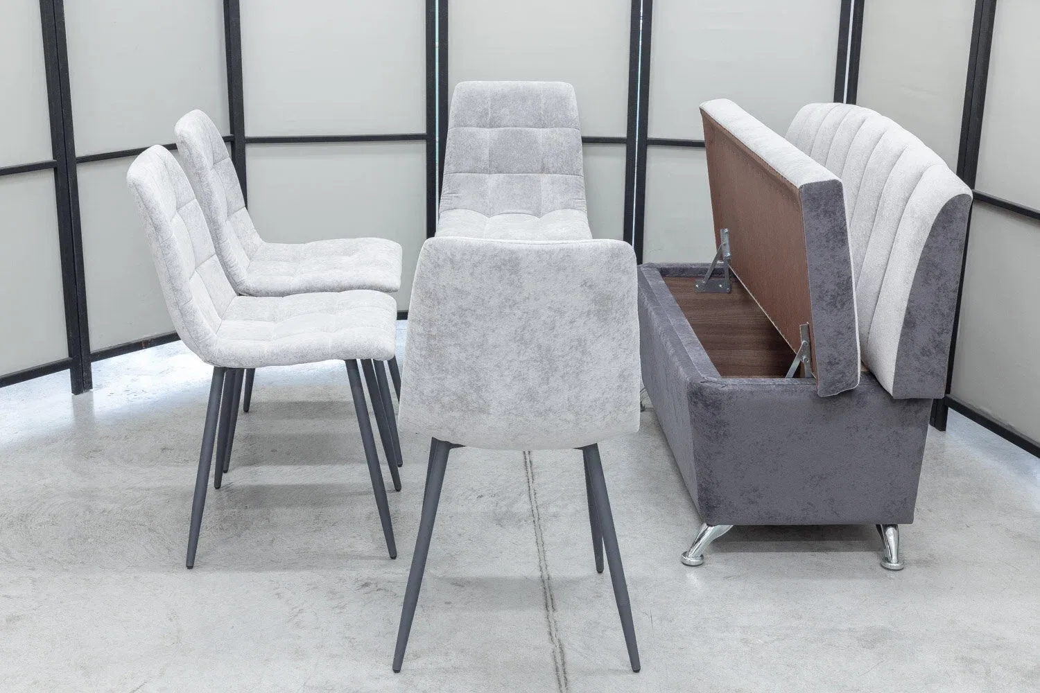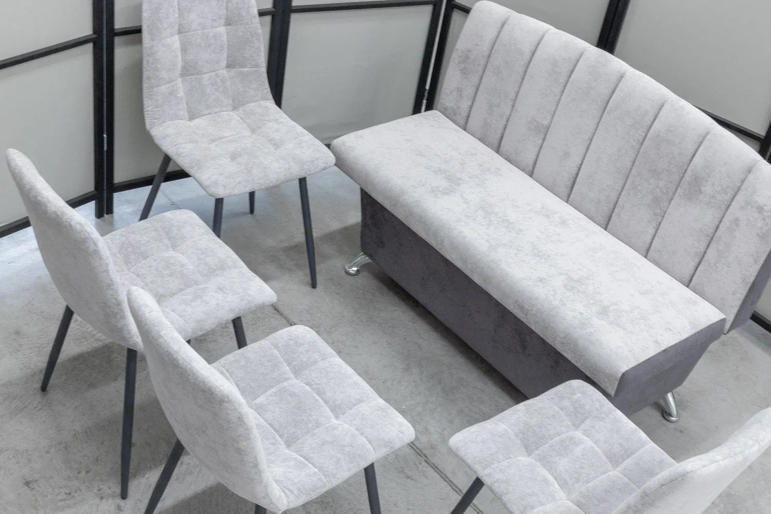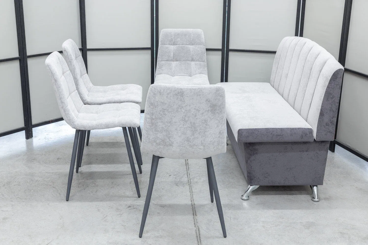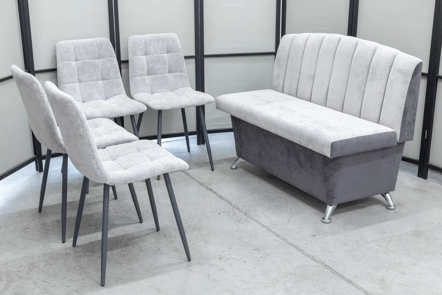 Комплект для кухни, состоящий из компактного диванчика и четырех стульев в одинаковой обивке.