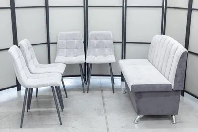Обивка дивана и стульев выполнена из мебельной ткани (флок), которая является антивандальной. Это означает, что ткань легко чистится (допускает влажную чистку) и устойчива к механическим повреждениям, таким как царапины и потертости (для любителей кошек и собак). Это особенно важно для кухонной мебели, так как она подвержена повышенному износу и загрязнению.