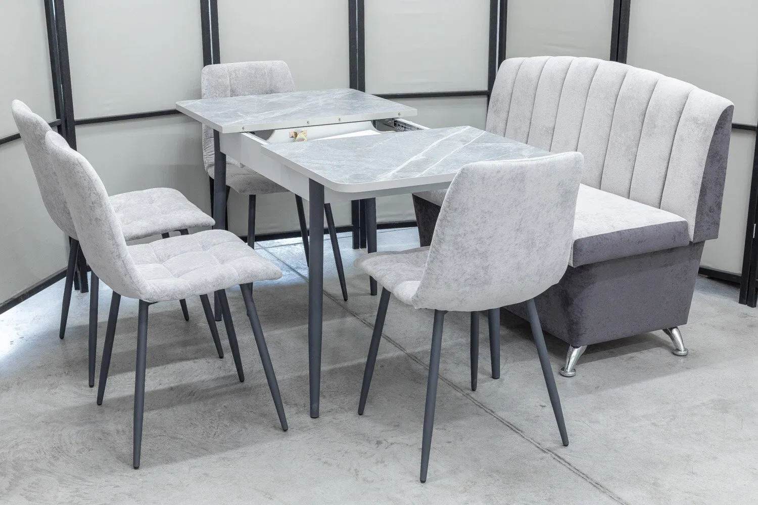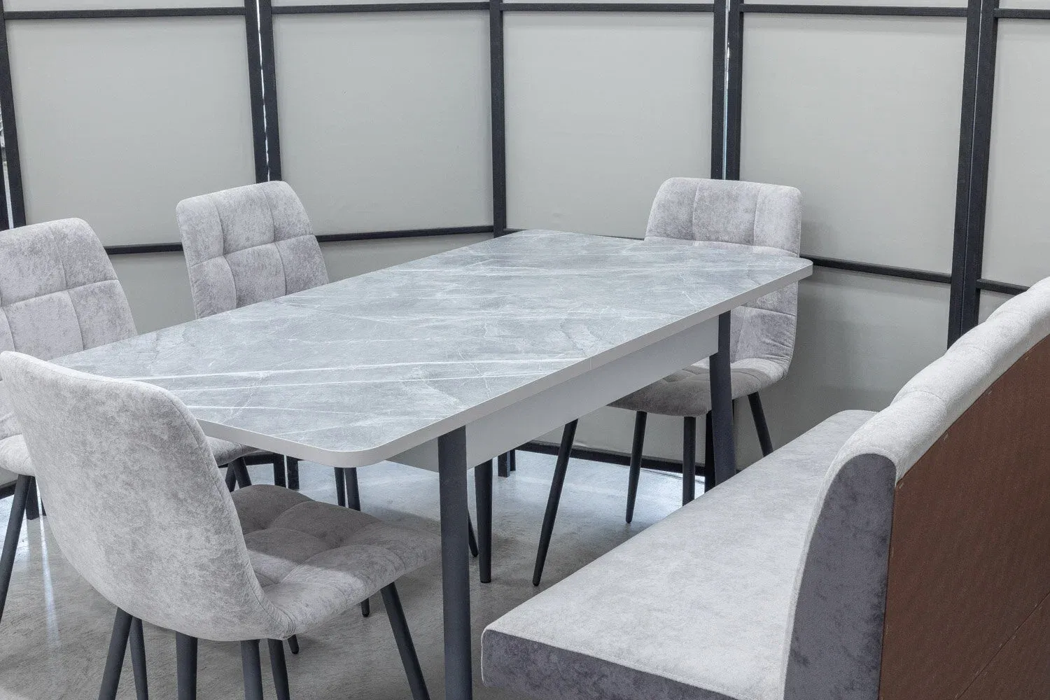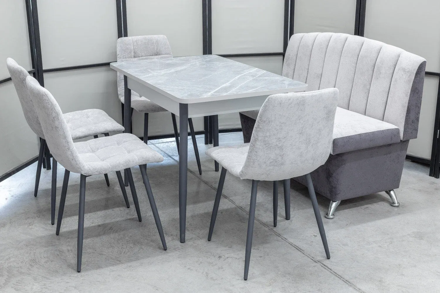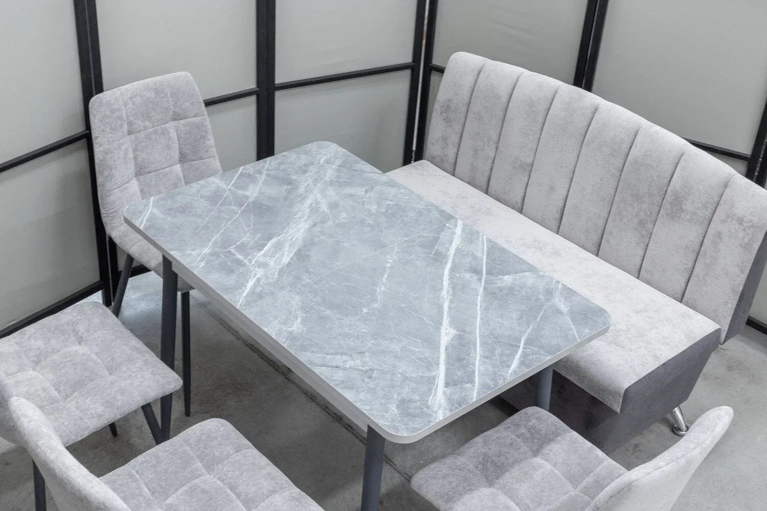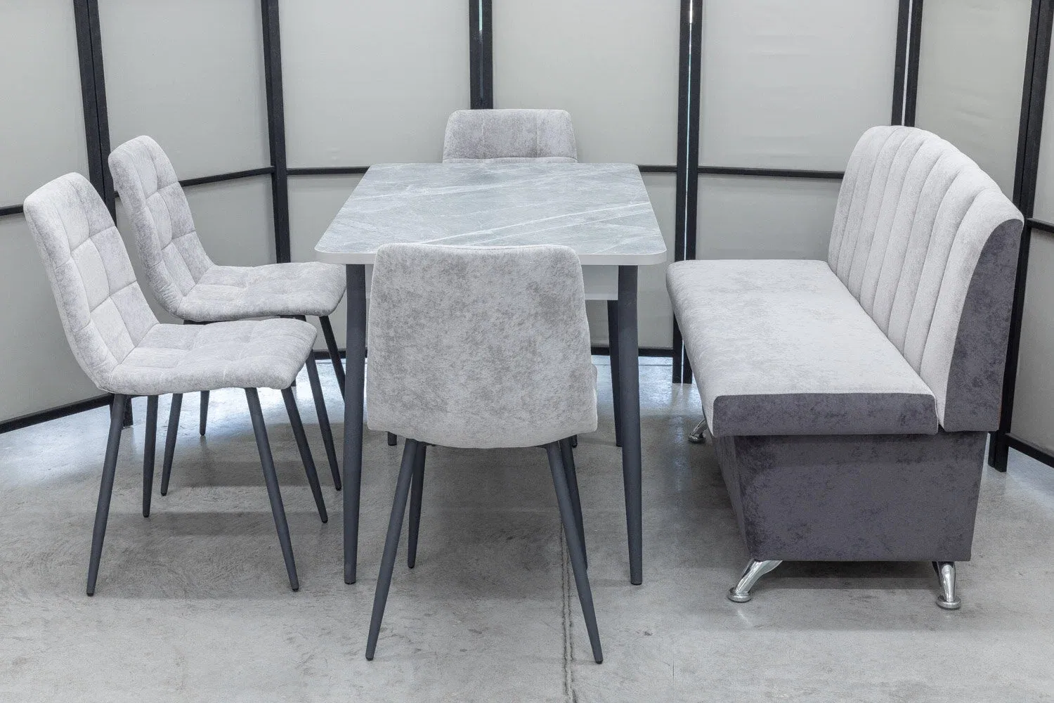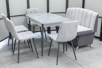 Обеденная группа состоящая из стола Ост и кухонного дивана Альт и 4-х стульев в одинаковой с диваном обивке.