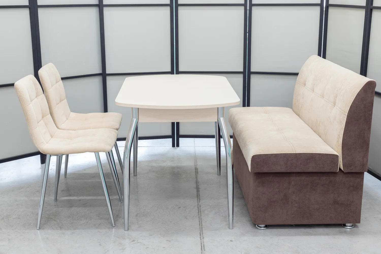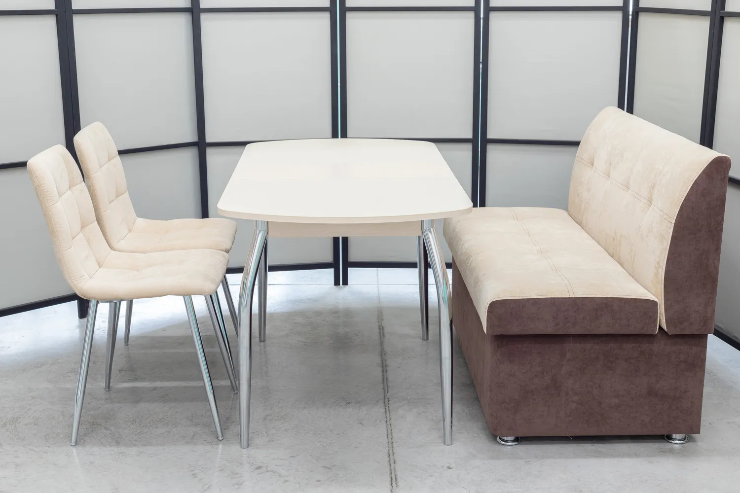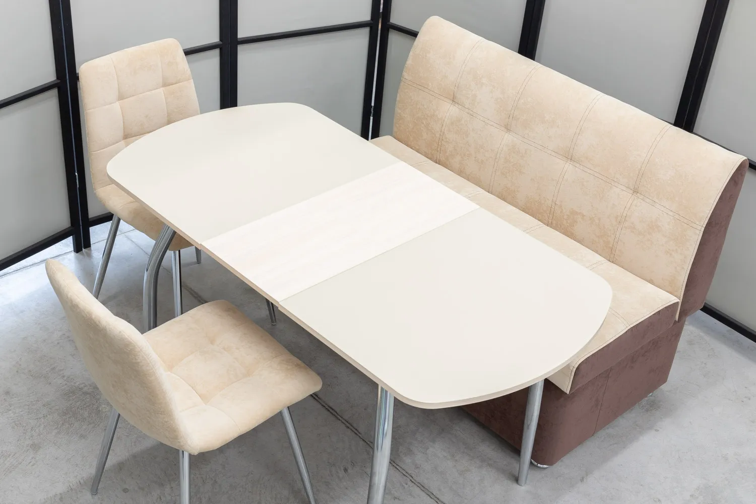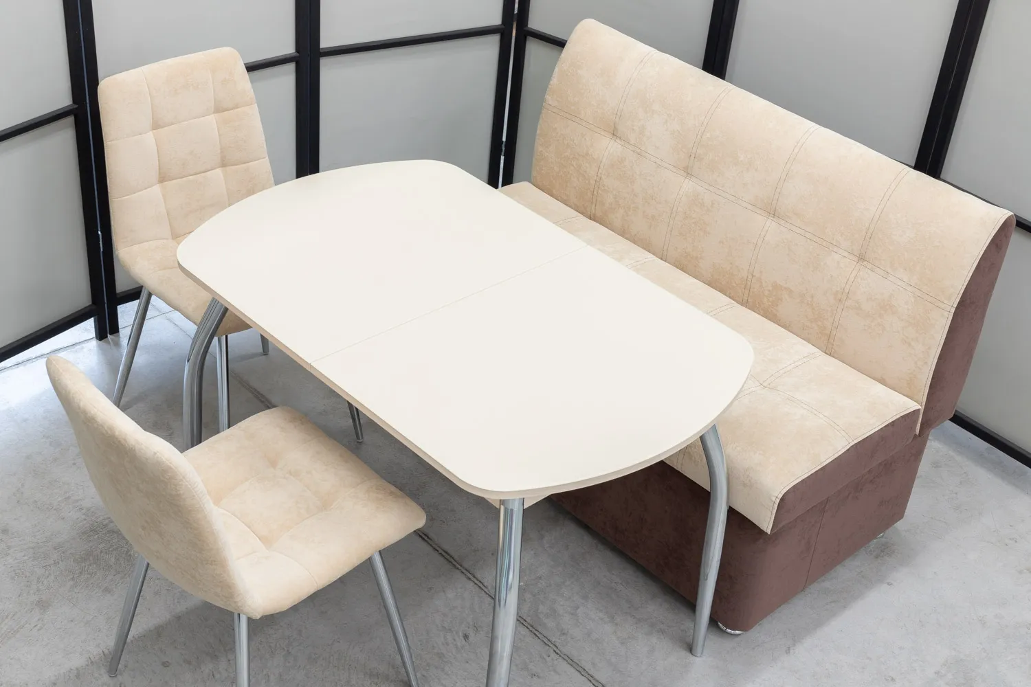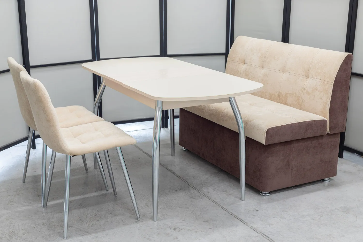 В каждом уголке обеденной группы "Тетра-1 Дуо" чувствуется гармония уюта и функциональности, сплетенная с элегантностью дизайна. Этот комплект, объединяющий в себе кухонный диван "Тетра", стеклянный стол и два стула, обитых в одном стиле с диваном, предлагает идеальное пространство для сборов с семьей и друзьями.Столешница из матового закаленного стекла, окрашенная в нежный кремовый цвет, станет неповторимым акцентом вашей кухни. Механизм раскладки "бабочка" позволяет легко увеличить длину стола, превращая обычный ужин в пир для большой компании. Хромированные гнутые ножки добавляют изысканность и легкость в общий вид.