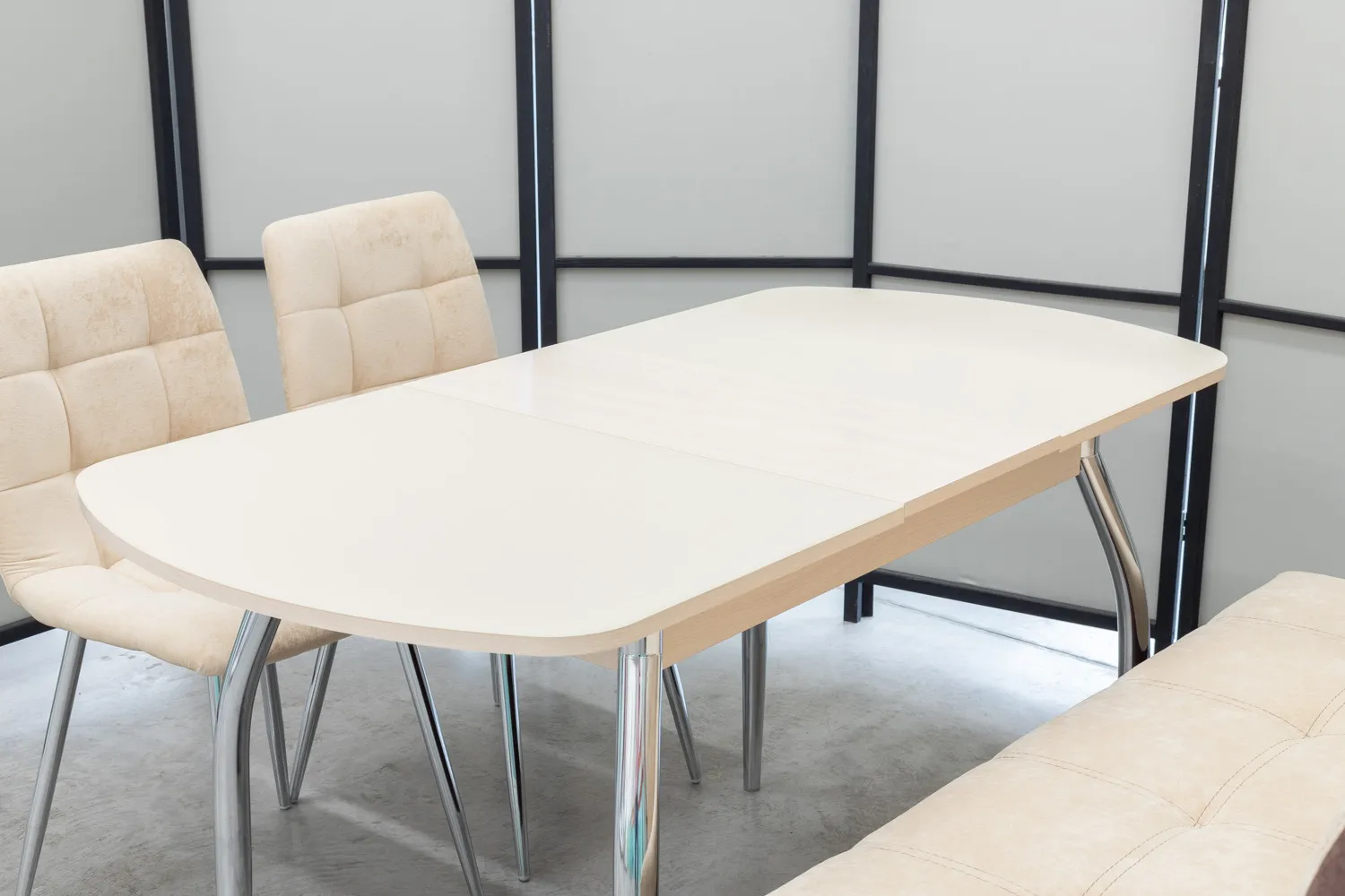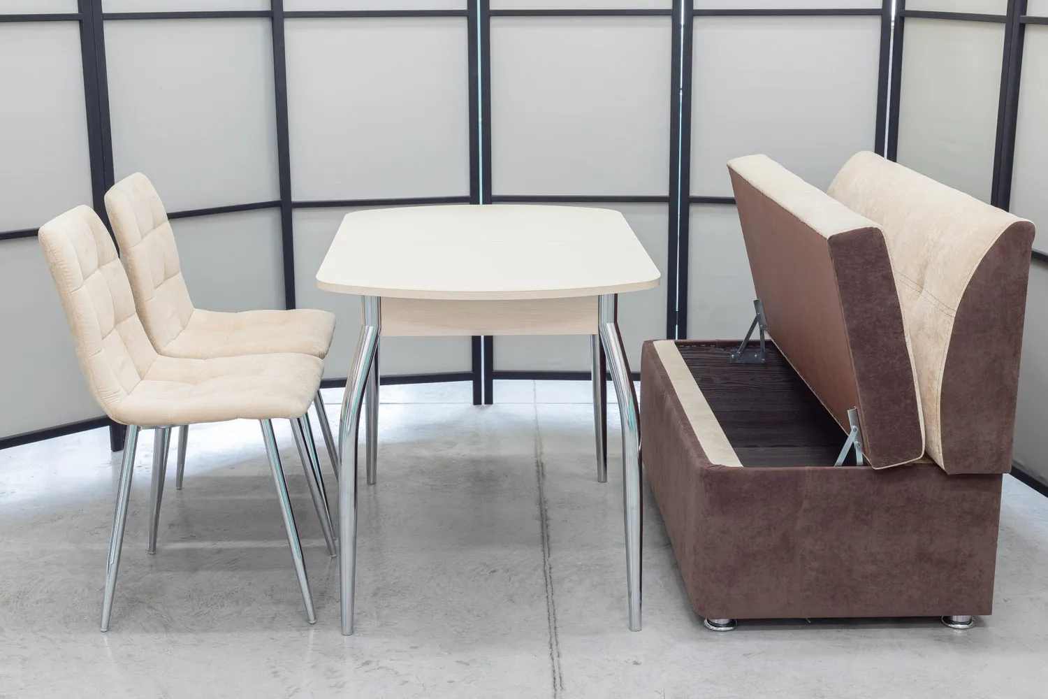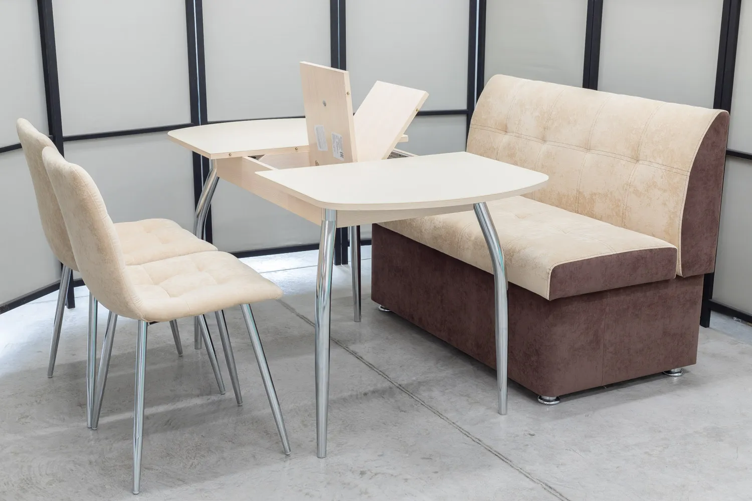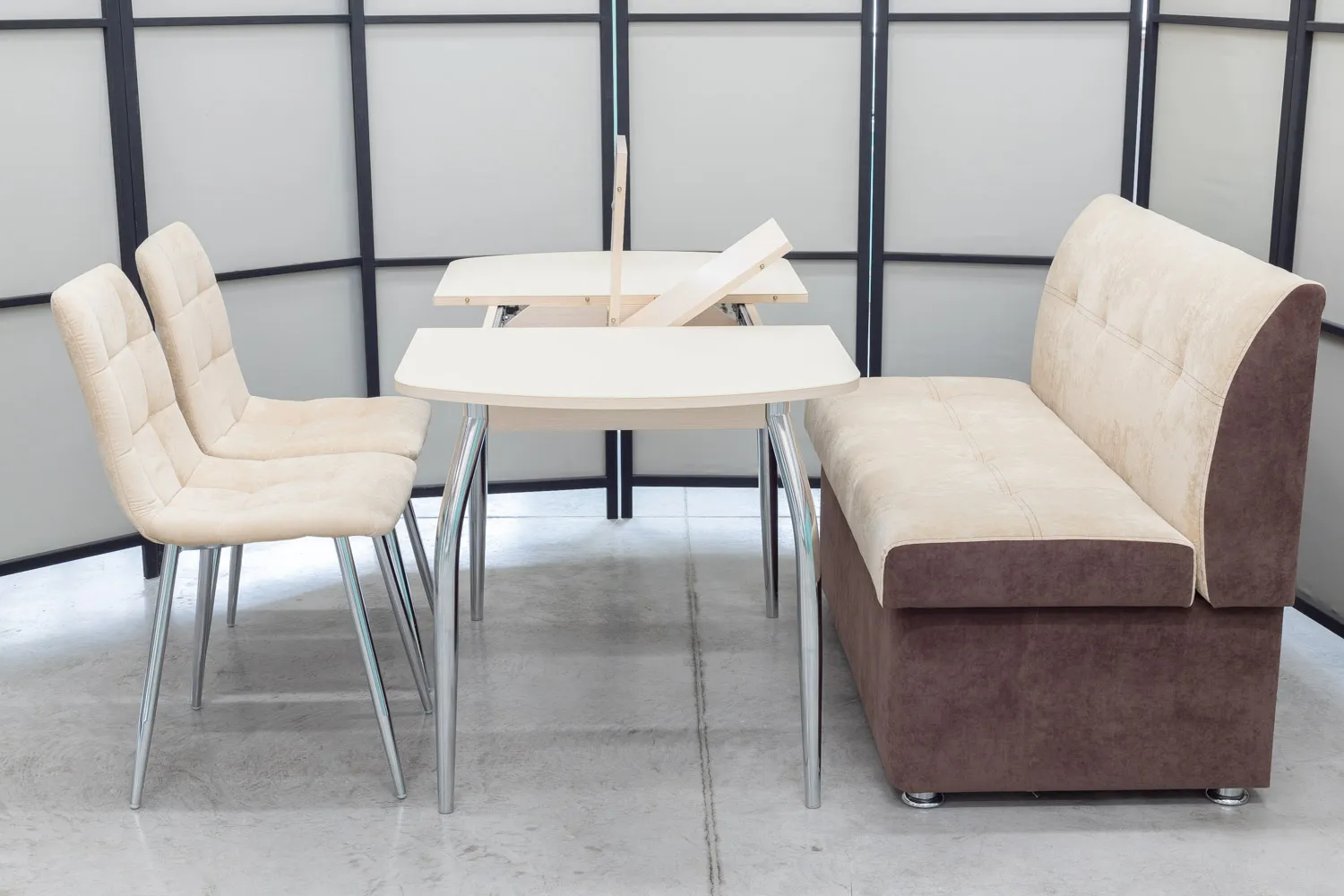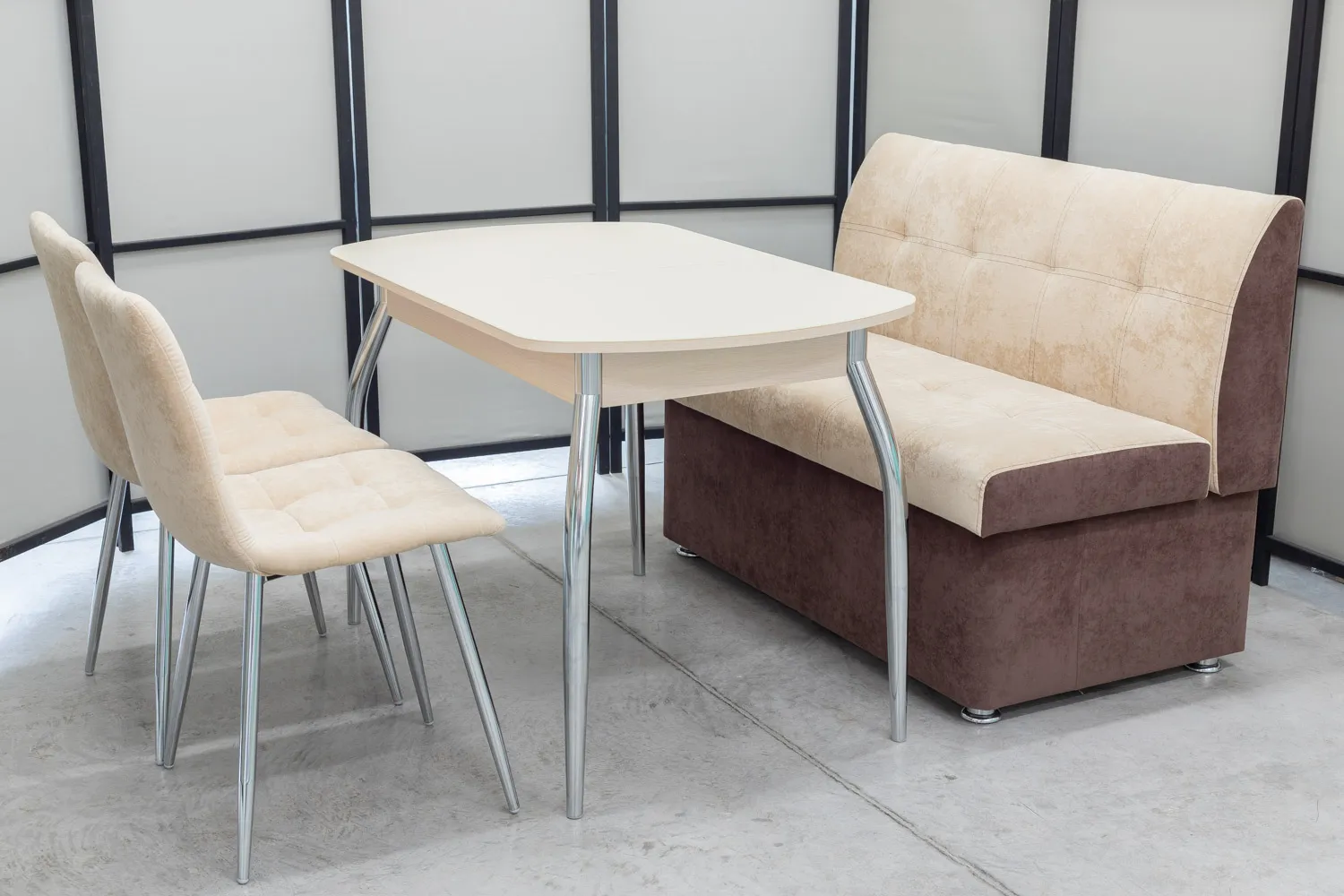 В каждом уголке обеденной группы "Тетра-1 Дуо" чувствуется гармония уюта и функциональности, сплетенная с элегантностью дизайна. Этот комплект, объединяющий в себе кухонный диван "Тетра", стеклянный стол и два стула, обитых в одном стиле с диваном, предлагает идеальное пространство для сборов с семьей и друзьями.Столешница из матового закаленного стекла, окрашенная в нежный кремовый цвет, станет неповторимым акцентом вашей кухни. Механизм раскладки "бабочка" позволяет легко увеличить длину стола, превращая обычный ужин в пир для большой компании. Хромированные гнутые ножки добавляют изысканность и легкость в общий вид.
