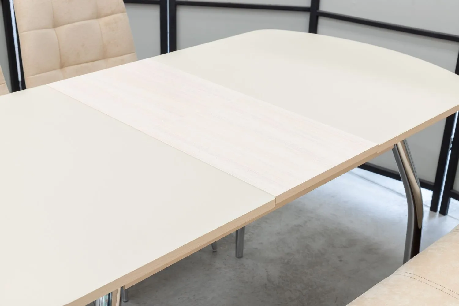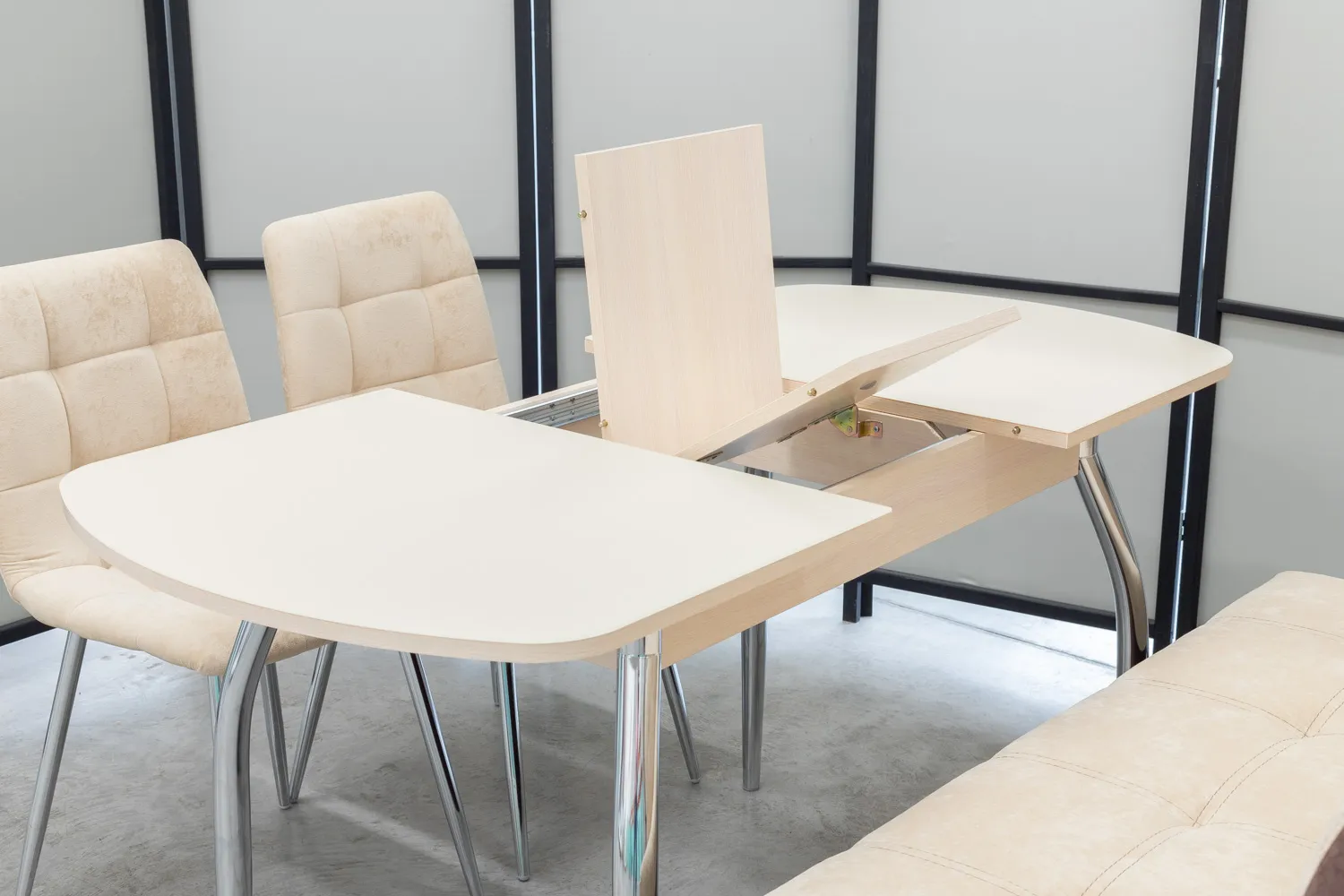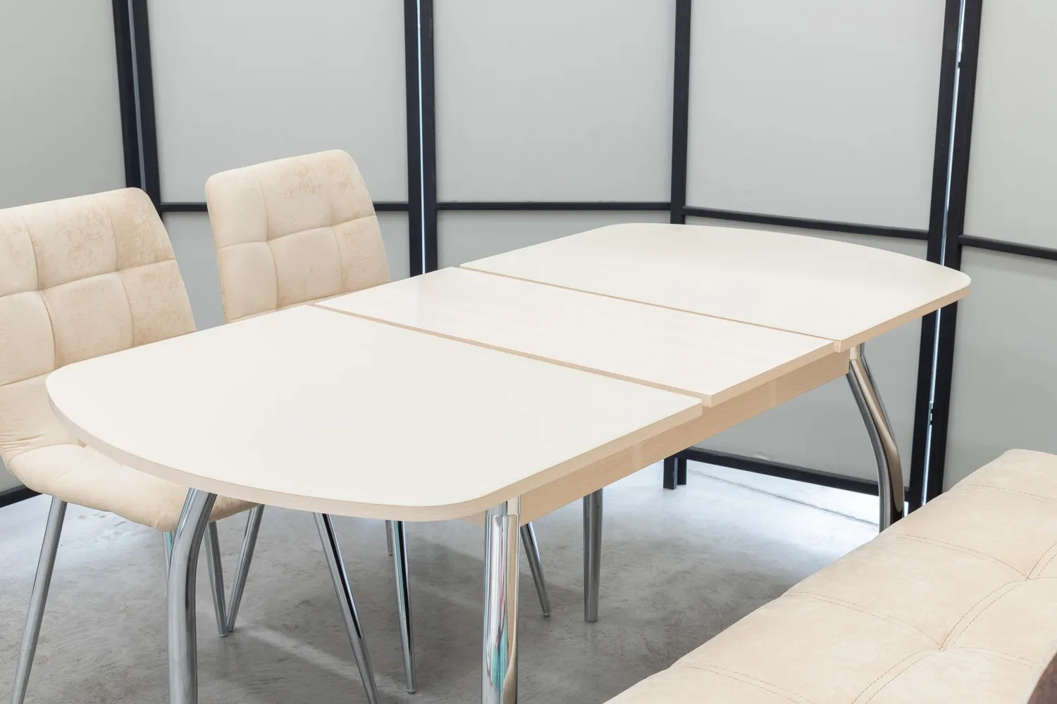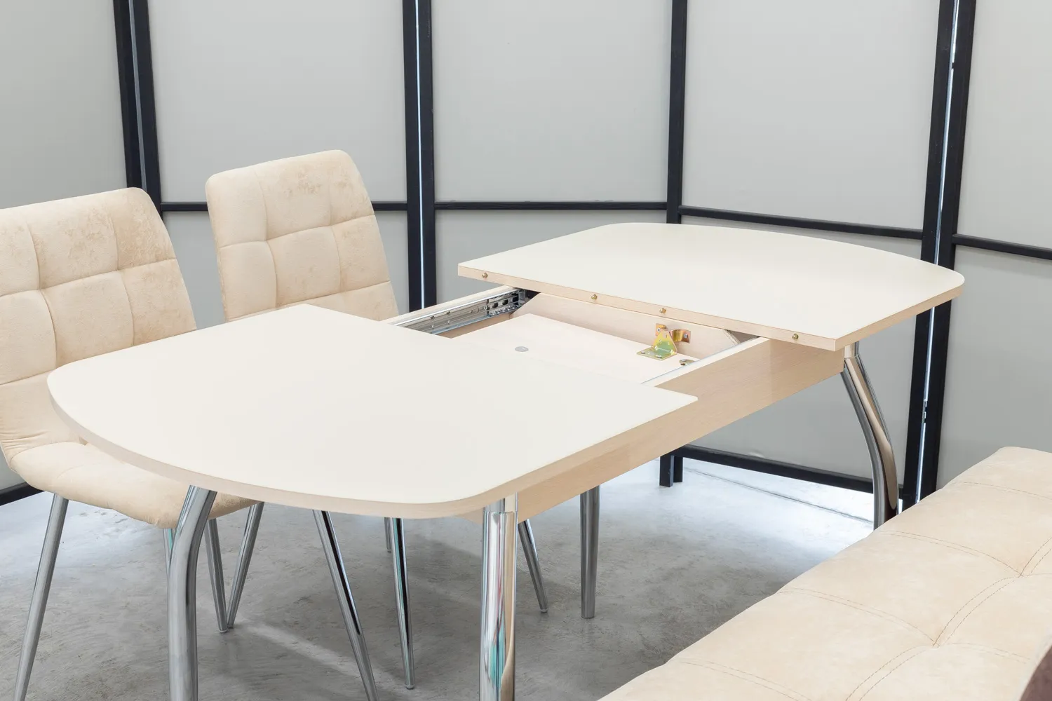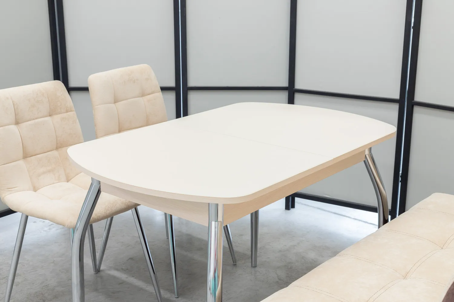 В каждом уголке обеденной группы "Тетра-1 Дуо" чувствуется гармония уюта и функциональности, сплетенная с элегантностью дизайна. Этот комплект, объединяющий в себе кухонный диван "Тетра", стеклянный стол и два стула, обитых в одном стиле с диваном, предлагает идеальное пространство для сборов с семьей и друзьями.Столешница из матового закаленного стекла, окрашенная в нежный кремовый цвет, станет неповторимым акцентом вашей кухни. Механизм раскладки "бабочка" позволяет легко увеличить длину стола, превращая обычный ужин в пир для большой компании. Хромированные гнутые ножки добавляют изысканность и легкость в общий вид.